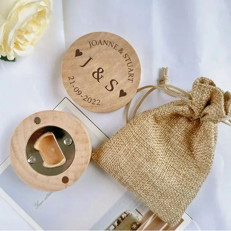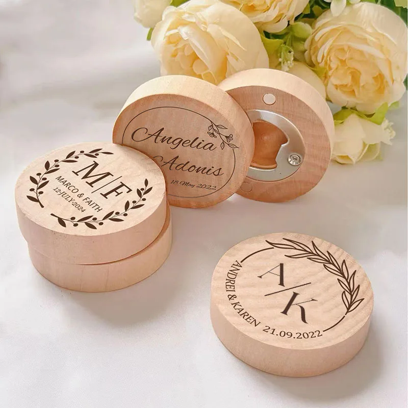 Personalized Wedding Favor Engraved Wooden Fridge Magnet Round Bottle Opener Wedding Guest Bautizo Birthday Custom Souvenir